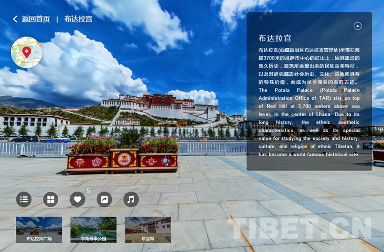 “實(shí)境西藏”展館,包含西藏自治區(qū)七地市共66幅360°實(shí)景圖,圖中包含西藏風(fēng)物實(shí)景以及漢英雙語簡(jiǎn)介。在這里,既有高遠(yuǎn)與寧靜,又有遼闊與雄奇,藍(lán)天白云、雪山冰川、佛塔寺廟、暗夜星軌……風(fēng)景如畫的西藏猶如長(zhǎng)軸畫卷緩緩鋪開。